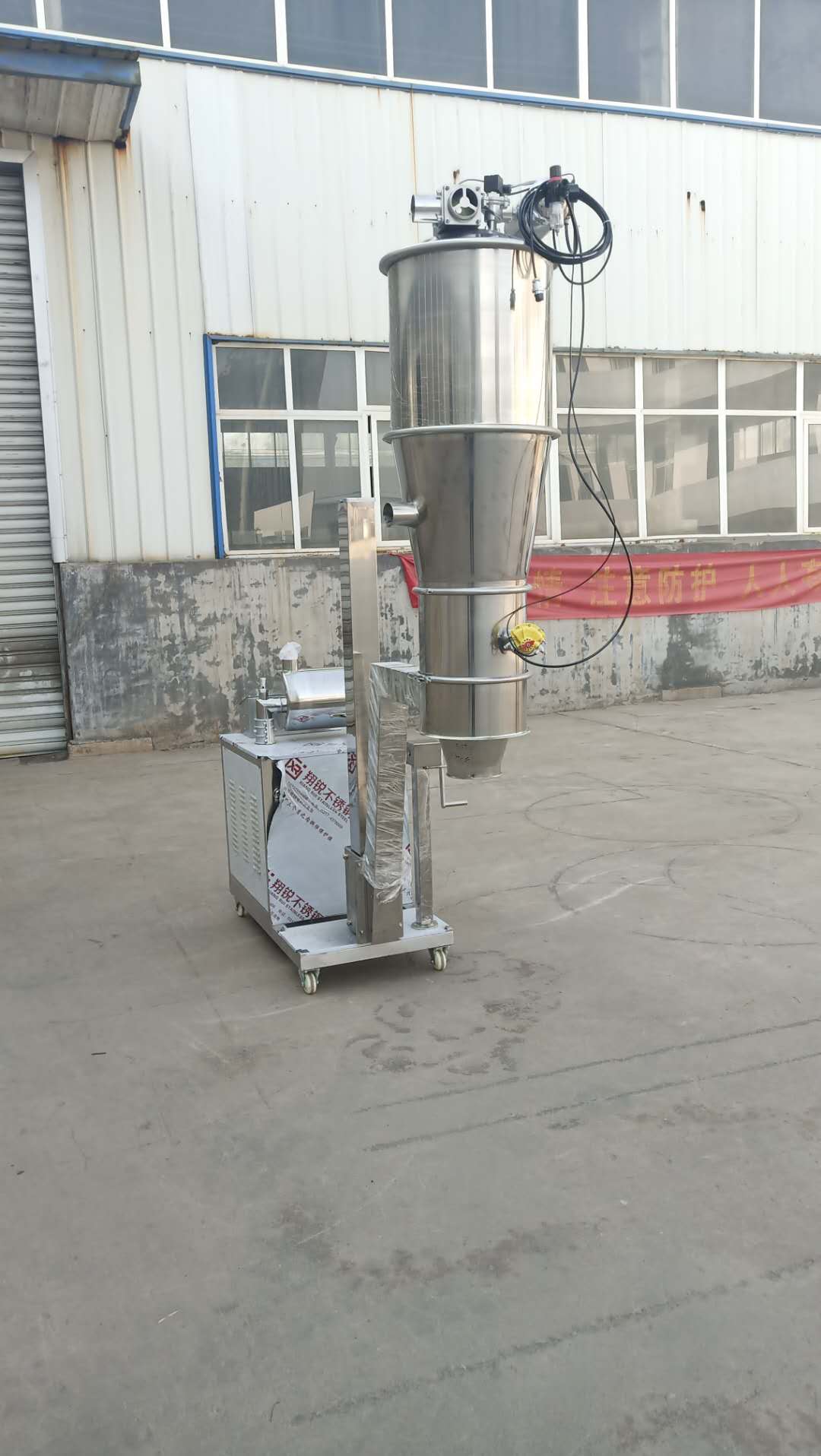 我公司生产的真空上料机是针对粉状料、粒状料、粉粒混合料的一种真空输送设备。真空上料机能自动地将各种物料输送到包装机、注塑机、粉碎机等料斗中,也能直接把要混合的物料输送到混合机(如V型混合机、二维混合机、三维混合机等)中,减轻了工人的劳动强度,解决了加料时粉尘外溢等问题,是制药厂、食品厂通过GMP认证,促进清洁、文明生产的首选设备。